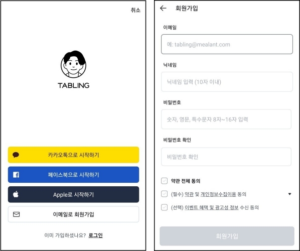 테이블링앱은 회원가입이 필요합니다. 카카오톡이나 페이스북, 이메일로 회원가입이 가능합니다. 카카오톡이나 페이스북으로 시작하기를 누르시면 이메일과 비밀번호 설정으로 간단히 회원가입이 가능합니다.