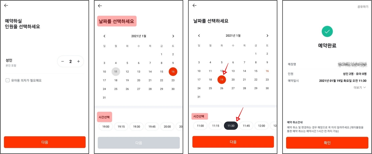 원하는 업체를 선택하고 즉시예약을 누르시면 인원선택 - 날짜선택 - 시간선택 의 팝업창이 순서대로 나옵니다. 나오는 순서대로 선택만 하시면 간단하게 예약이 완료됩니다.