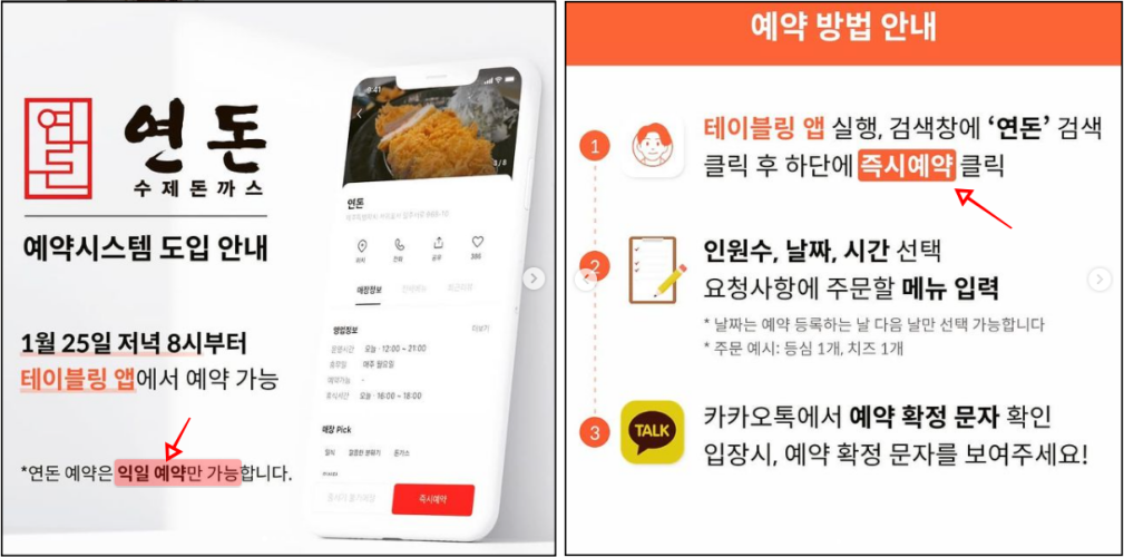 앞으로 연돈은 매장에서 예약을 받지 않습니다. 반드시 테이블링 앱을 통해 예약해야만 이용이 가능합니다.